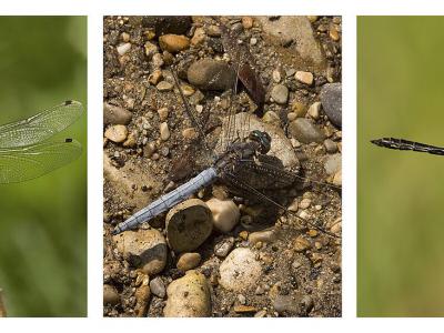 不同颜色的蜻蜓品种(从左到右):小白脸(Leucorrhinia dubia)是一种深色品种,主要在...