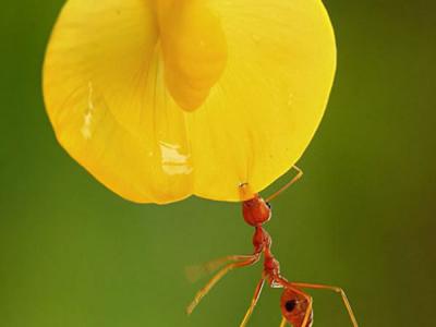 “大力”蚂蚁正在用后腿举起巨大的花瓣,准备作为“建筑材料”拖向巢穴 图片上这...