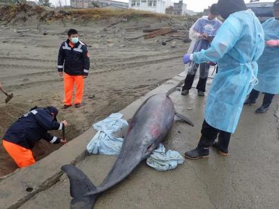 台湾“中华鲸豚协会”在苗栗县通霄白沙屯海边发现一只死亡瓶鼻海豚 (神秘的...
