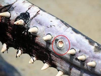 有已死抹香鲸的牙齿(红圈)被人拔掉偷去 7条抹香鲸尸体日前搁浅在阿德罗桑一处...