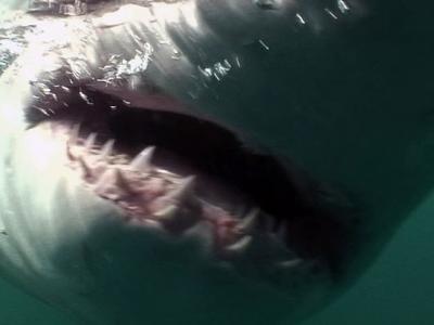 相机意外拍下鲨鱼张开血盆大口的一刻。 鲨鱼游开后,镜头留下一条长刮痕。 ...