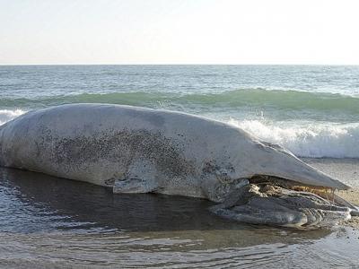 一条相信是小须鲸的鲸鱼尸体被冲上沙滩。 鲸鱼尸体已开始腐烂。 有途人走近...