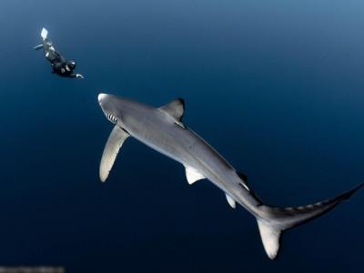 他们在深海中与大白鲨畅泳 大白鲨与2人同游,仿如共舞。 2人当日还有遇到其...
