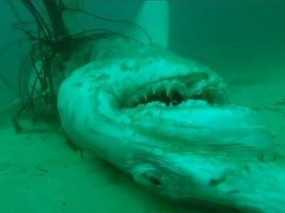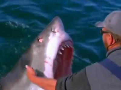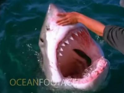 不知大白鲨是已食饱还是超温驯,它半探头地让渔民“摸个够”。 (神秘的地球报道...