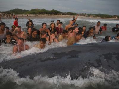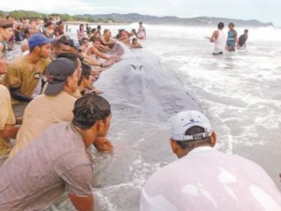 尼加拉瓜50人送搁浅鲸鱼回海中