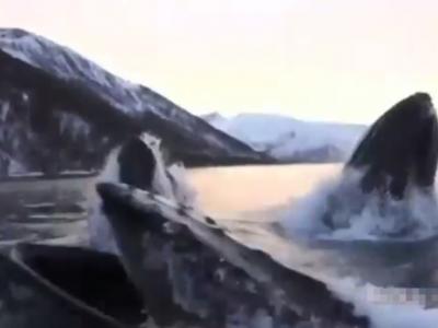 座头鲸群突然浮出水面张口呼吸,近到渔夫几乎可以伸手触及。 鲸群激起大片浪花...