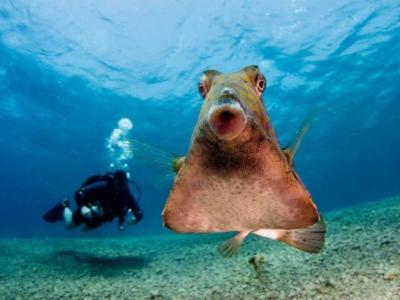 红海潜水在海底遇上硬鳞鱼抢镜 (神秘的地球报道)以色列48岁潜水员托夫,早前在...