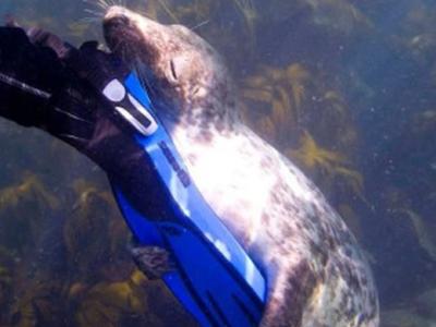 英国摄影师到锡利群岛潜水遇上一头可爱小海豹抱住蛙鞋不肯放手 海豹仔不怕生保...