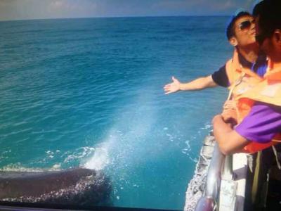 台湾花莲赏鲸 抹香鲸靠近喷水 (神秘的地球报道)台湾花莲赏鲸船业者载游客出海...