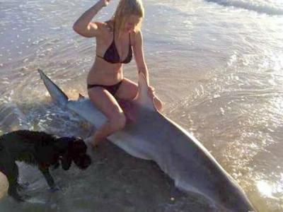 澳洲少女骑上一条3米长搁浅死亡的鲨鱼身上作状殴打 少女拥抱搁浅鲨鱼 (神秘...