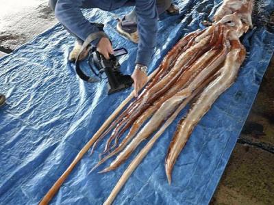 日本新潟县佐渡岛26日捕获两条巨型鱿鱼 研究人员准备接收鱿鱼用作研究资料 (...