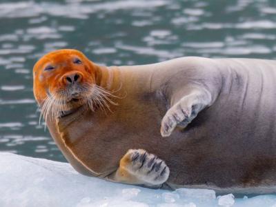 挪威斯瓦尔巴特群岛一只红脸“关公”海豹