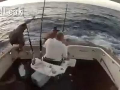 被钓到的旗鱼突然跳上船差点插死钓鱼人