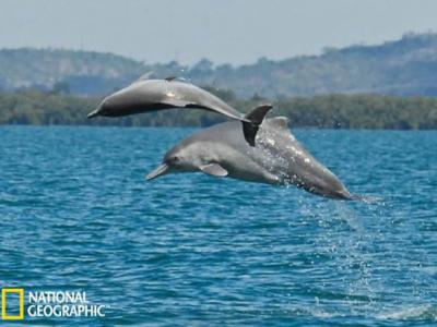 在澳大利亚北部海域,两头尚未命名的驼背海豚个体跳出海面 (神秘的地球uux.cn)...