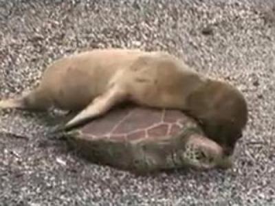 小海狮骑上海龟兜风 (神秘的地球uux.cn)一只小海狮遇见海龟,竟然二话不说爬上...