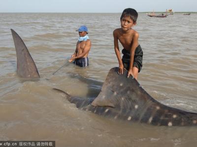 印尼爪哇岛一名男孩骑在一头鲸鲨背部 印尼爪哇岛一名男孩骑在一头鲸鲨背部 ...