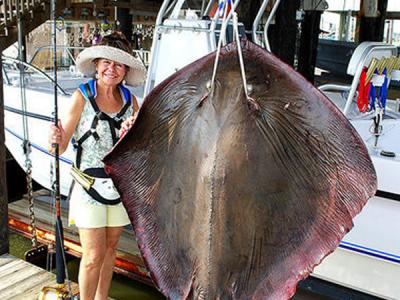 美国老太太钓到84公斤巨型魟鱼 据ETtoday:美国路易斯安那州7月13日举行一场钓鱼...
