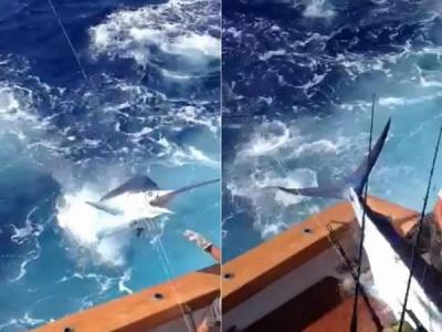 一条重达350磅的巨型蓝枪鱼跃入游艇险些