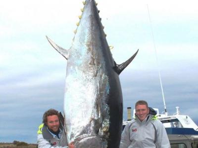 托沃斯(左)和库克在加拿大新斯科舍省附近进行垂钓旅行时捉到这条1000磅重的蓝鳍金...