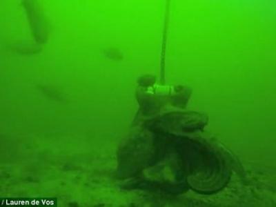 这只章鱼用触角将整个诱饵笼包裹起来,仔细地进行检查 它开始猛拉连接船只的链...