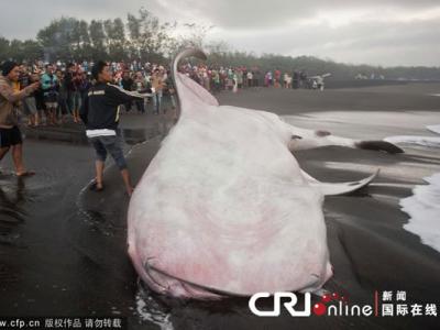 印尼班图尔一头鲸鲨在海滩搁浅死亡