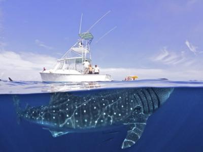 这幅令人震惊的图片展示了一头15米长鲸鲨在一艘10米长豪华游艇附近浮出水面的情景...
