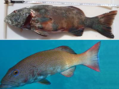 珊瑚鳟鱼(上)身上的黑斑可能是皮肤癌,正常鱼类(下)未出现此种状况。 一项最...