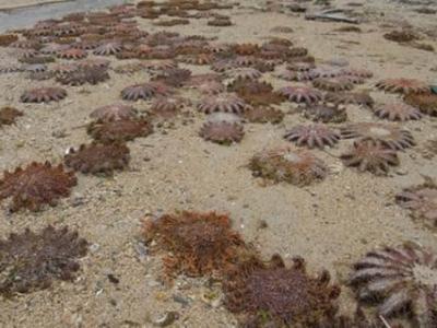 日本石垣岛海洋学家发现大量的棘冠海星搁浅于沙滩上 这些多触手的海星因为它们...
