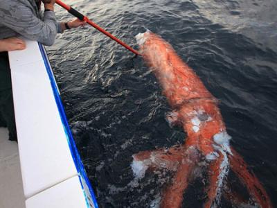 鱿鱼能长到这个长度很正常,但能真正看见就不同寻常了,因此这个超级大鱿鱼使麦克...