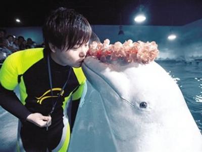 天津海洋世界白鲸过生日 头戴花冠致谢