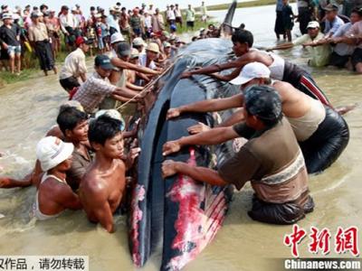 缅甸海边发现死亡鲸鱼 民众合力埋葬 缅甸海边发现死亡鲸鱼 民众合力埋葬 缅...
