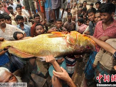 孟加拉国渔民捕获一条罕见的金色大鲷鱼