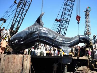 巴基斯坦渔民利用起重机把这头死鲸鲨从水里拖上来 这头40英尺(12.19米)长的鲸...