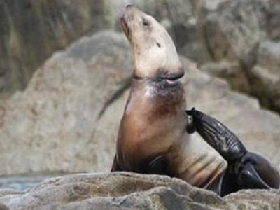 一只海狮被风向标困住了身体,最终溺死在海中,尸体被冲到岸边 一只海狮颈部被...