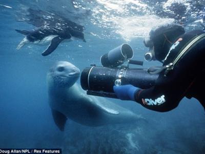 海豹对着陌生镜头摆出“微笑” 海豹正吞食捕获的企鹅 近日,摄影师道格·艾伦...