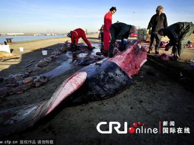 荷兰港口发现一具鲸鱼尸体 2012年1月16日,荷兰弗利辛恩,一头鲸鱼被莱顿市博...