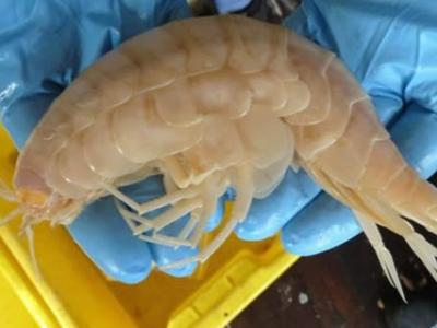 一只从新西兰科马德克海沟捕获的片脚类动物 相比之下,其它海域发现的片脚类一...