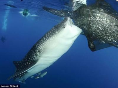 印度尼西亚海域,一头身躯巨大的鲸鲨张开大嘴,偷食渔网中的凤尾鱼 两头鲸鲨正...