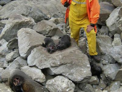 2010年12月2日,新西兰,凯库拉:新西兰自然护理署的官员Phil Bradfield站在7头死...