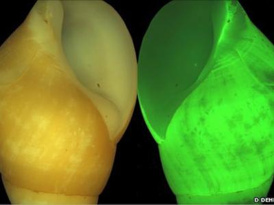 一块哺乳动物头骨化石,牙齿窝里的沉积物,原来是史前蜜蜂筑的巢穴。图片来源:uux...