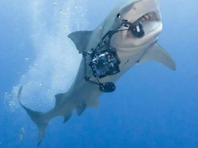 这头虎鲨在巴哈马海底实施抢劫,得手之后带着昂贵的照相机从容游走。 实施抢...