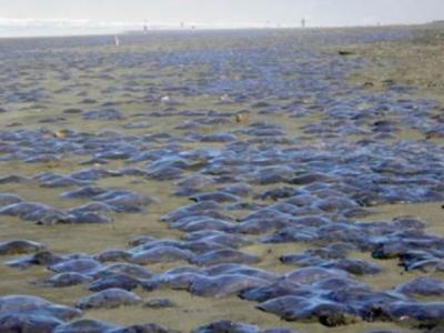 美国旧金山海滩有数千只水母被冲上岸 这是被冲上岸的一只外形古怪的海月水母 ...