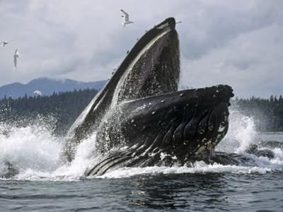阿拉斯加东南部查塔姆海峡(Chatham Strait)水域,一头巨大的座头鲸张开大嘴跃出...