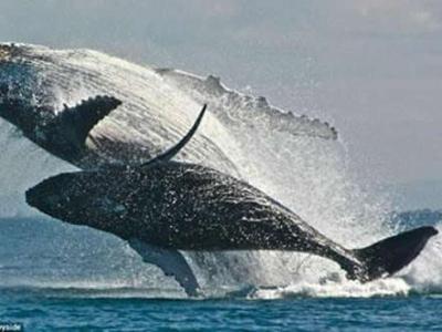 两只鲸鱼一起跳起来!驼背鲸妈妈带着宝宝一起飞跃真是令人难忘的动作画面。 驼...