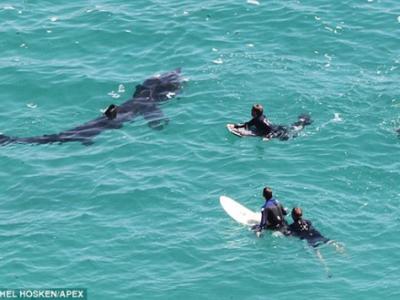 在康沃尔的波斯科诺海滩,一群冲浪爱好者遭遇一头身长14英尺的姥鲨。 姥鲨看上...