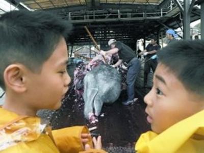 2009年6月21日,东京东南部,两名日本儿童正在观看捕鲸者处理新捕到的一头鲸。 ...