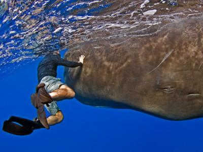 在加勒比海多米尼克近海,一名潜水员潜到水下与抹香鲸玩耍,美国佛罗里达州的彼...
