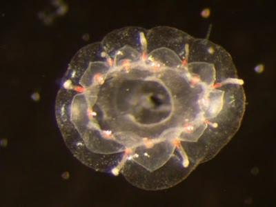 把生殖器露在体外的新类水母呈飞碟状,顶部环绕着一群生殖器。 澳大利亚塔斯...