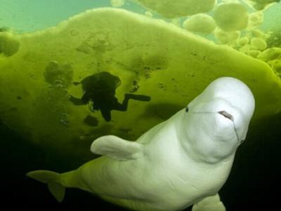 一名队员勇敢地进入零下10摄氏度的水域,靠近白鲸。 在俄罗斯白海北极圈潜水中...