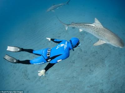 威廉姆-温拉姆和皮埃尔-弗洛拉仅穿游泳衣在南非海岸附近与虎鲨共舞 在东太平洋...